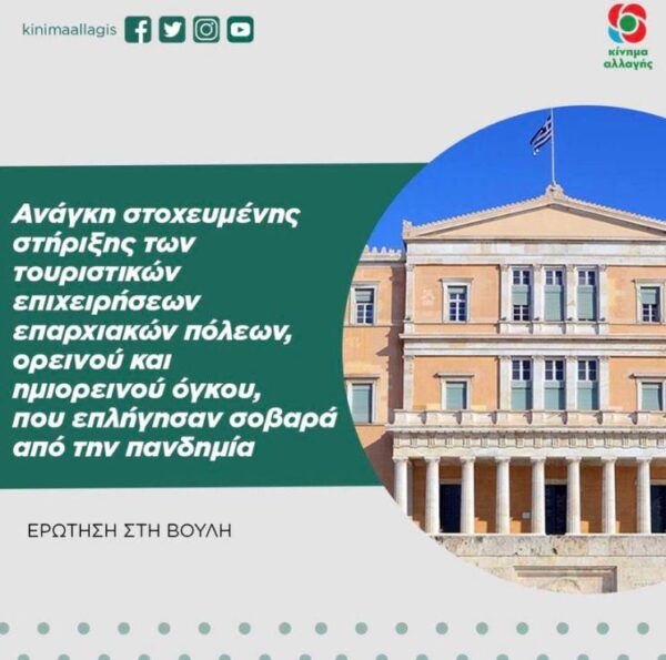 Θέμα: « Ανάγκη στοχευμένης στήριξης των τουριστικών επιχειρήσεων επαρχιακών πόλεων, ορεινού και ημιορεινού όγκου, που επλήγησαν σοβαρά από την πανδημία»
