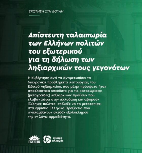 Στην ερώτηση επισημαίνεται πως η κυβέρνηση αντί να αντιμετωπίσει τα διαχρονικά προβλήματα λειτουργίας του Ειδικού Ληξιαρχείου, που μέχρι πρόσφατα ήταν αποκλειστικά υπεύθυνο για τις καταχωρίσεις (μεταγραφές) ληξιαρχικών πράξεων που έλαβαν χώρα στην αλλοδαπή και αφορούν Έλληνες πολίτες, επέλεξε να τα μετατοπίσει στα έμμισθα Ελληνικά Προξενεία που με το ν. 4674/2020 αναλαμβάνουν σχεδόν εξολοκλήρου την εν λόγω αρμοδιότητα.