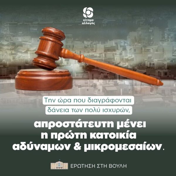 ΘΕΜΑ: «Απροστάτευτη η πρώτη κατοικία των αδύναμων και μικρομεσαίων, την ώρα που διαγράφονται δάνεια των κατά τεκμήριο οικονομικά πολύ ισχυρών»
