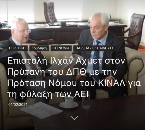 ΔΕΛΤΙΟ ΤΥΠΟΥ: ΕΠΙΣΤΟΛΗ ΙΛΧΑΝ ΑΧΜΕΤ ΠΡΟΣ ΤΟΝ ΠΡΥΤΑΝΗ ΤΟΥ Δ.Π.Θ. ΓΙΑ ΤΗΝ ΠΡΟΤΑΣΗ ΝΟΜΟΥ ΤΟΥ ΚΙΝΑΛΛ ΓΙΑ ΤΗΝ ΦΥΛΑΞΗ ΤΩΝ ΠΑΝΕΠΙΣΤΗΜΙΩΝ