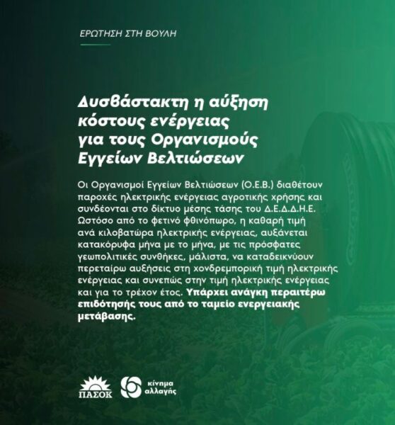 ΘΕΜΑ: «Δυσβάστακτη η αύξηση κόστους ενέργειας για τους ΟΕΒ – Ανάγκη περαιτέρω επιδότησής τους από το ταμείο ενεργειακής μετάβασης»