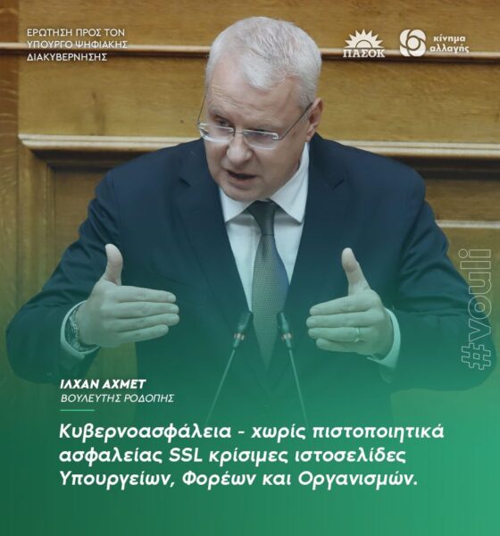 Ερώτηση προς τον Υπουργό Ψηφιακής Διακυβέρνησης κ. Κ. Πιερρακάκη κατέθεσε ο βουλευτής Ροδόπης και Τομεάρχης Ψηφιακής Πολιτικής του Κινήματος Αλλαγής κ. Ιλχάν Αχμέτ, σχετικά με τις σοβαρές ελλείψεις στο επίπεδο της κυβερνοασφάλειας και την απουσία Πιστοποιητικών Ασφαλείας SSL από ιστοσελίδες Υπουργείων, Φορέων και Οργανισμών.