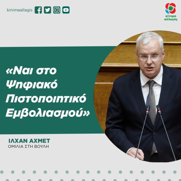 Με την ιδιότητα του ως τομεάρχη ψηφιακής πολιτικής του Κινήματος Αλλαγής, μίλησε κατά την συζήτηση και ψήφιση του νομοσχεδίου «Κύρωση της από 30.5.2021 Πράξης Νομοθετικού Περιεχομένου “Θέσπιση, περιεχόμενο και διαδικασία έκδοσης Ψηφιακού Πιστοποιητικού COVID-19” (Α΄87) και ειδικότερες εγγυήσεις για την προστασία των δεδομένων προσωπικού χαρακτήρα», ο βουλευτής Ροδόπης του Κινήματος Αλλαγής, Ιλχάν Αχμέτ.