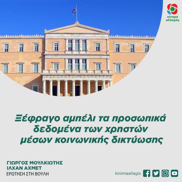 Ερώτηση με αρ.πρ.5949/13/4/21  προς τον Υπουργό Ψηφιακής Διακυβέρνησης κατέθεσαν οι βουλευτές με το Κίνημα Αλλαγής Ιλχάν Αχμέτ και Γιώργος Μουλκιώτης, σχετικά με τη διαρροή προσωπικών δεδομένων χρηστών από γνωστές ηλεκτρονικές πλατφόρμες κοινωνικής δικτύωσης.
