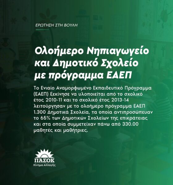 - Γιατί τρία χρόνια τώρα συντηρείτε το «φτωχό σχολείο» των ΣΥΡΙΖΑ-ΑΝΕΛ και δεν έχετε επαναφέρει το επιτυχημένο και αξιολογημένο Ολοήμερο Δημοτικό Σχολείο με πρόγραμμα ΕΑΕΠ;