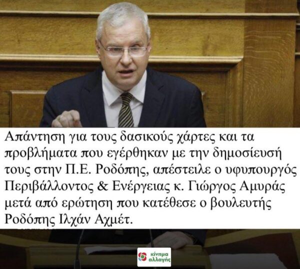 Απάντηση για τους δασικούς χάρτες και τα προβλήματα που εγέρθηκαν με την δημοσίευσή τους στην Π.Ε. Ροδόπης, απέστειλε ο υφυπουργός Περιβάλλοντος & Ενέργειας κ. Γιώργος Αμυράς μετά από ερώτηση που κατέθεσε ο βουλευτής Ροδόπης Ιλχάν Αχμέτ.