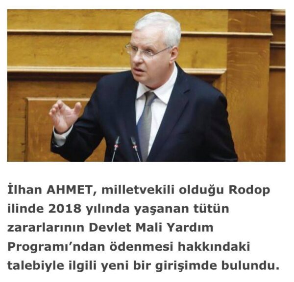 İlhan AHMET, milletvekili olduğu Rodop İli’nde 2018 yılında yaşanan tütün zararlarının Devlet Mali Yardım Programı’ndan ödenmesi hakkındaki talebiyle ilgili yeni bir girişimde bulundu.