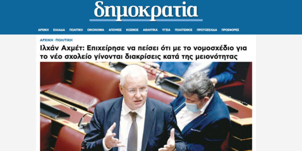 Batı Trakya Türkleri ve Türkiye’yle ilgili aşırı milliyetçi yayınlarıyla tanınan Dimokratia Gazetesi 28 Temmuz 2021 tarihli sayısında, Rodop Milletvekili İlhan Ahmet’i azınlık eğitimiyle ilgili meclis konuşması nedeniyle eleştirdi ve İlhan Ahmet’i “Ankara’nın hoparlörü” olmakla itham etti.